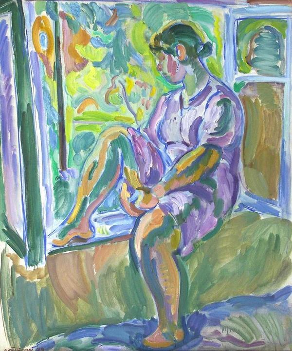 На переднем плане изображена девушка, сидящая на подоконнике: левая нога опущена на пол, правая согнута в колене и поставлена на подоконник. Фигура модели выполнена крупными, сочными мазками, что характерно для пастозной живописи, а абрис выделен насыщенным синим цветом. Лицо не прописано, волосы собраны в пучок на затылке. На втором плане расположены открытые створки окна и схематично обозначенный пейзаж. Композиция построена с акцентом на яркий и сочный колорит: преобладают сине-фиолетовые и зелёные оттенки с добавлением охристо-коричневого и жёлтого.