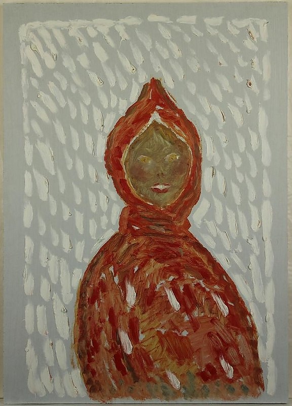 На полотне представлено поясное изображение девушки на белом фоне. Фигура занимает центральное место композиции. Девушка одета в красный платок и одежду. Лицо выполнено в охристо-зелёных тонах с жёлтыми глазами, нос обозначен двумя точками, губы выделены красным цветом.