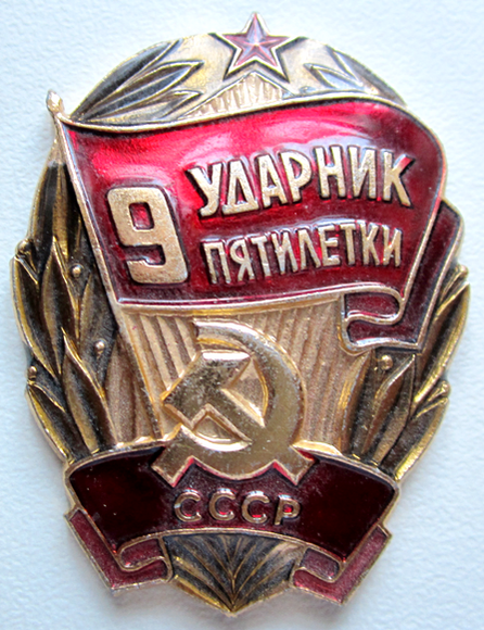 Для поощрения отличившихся трудящихся СССР, Постановлением Президиума ВЦСПС от 27 февраля 1974 года «Об утверждении образца единого общесоюзного знака „Ударник девятой пятилетки“» был учреждён знак «Ударник 9 пятилетки».[3] (Этот знак СССР входит в перечень ведомственных знаков отличия в труде, дающих право на присвоение звания «Ветеран труда»).
