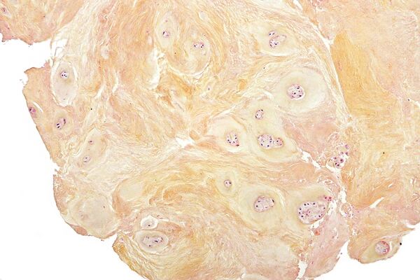 Обычными маркерами дегенеративного процесса при гистологическом исследовании являются фиброхрящевая ткань и наличие кластеров хондроцитов, которые свидетельствуют о реперативном процессе. Воспалительный процесс не обязательно сопровождает ДДЗД. Гистологическое исследование фрагментов диска, подвергшихся резекции для предполагаемого ДДЗД является обычным делом, чтобы исключить злокачественные новообразования.
