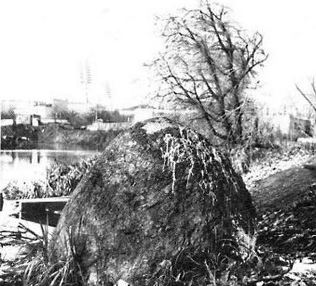 В старину тут был везде лес, непроходимая болотная тхлань, одним словом, сплошная глушь. Как пойдет в эту чащу человек, так и задуриться, замутиться у него голова. Черти его водят по болоту, поколь человек ни завязнет в трясине. Вот на пригорке, на высоком бурте, средь этого леса стоял этот камень. Ходили о нём в народе слухи: кто овладеет этим камнем, тот станет богатым и счастливым. Вот и захотелась Лесавику и Водяному завладеть камнем. Поспорили. Чтобы развязать спор, пошли к своему старшему. Тот предложил им: кто без передыху вознесёт камень на пересечение дорог, тот и будет хозяин этого камня. Бросили жребий, кто первым пойдет. Первым стал Лесавик. Но, как ни старался Лесавик, поднять камня он ни сумел. Ни помогли яму и его подчиненные, лесные звери. Тогда взялся за камень Водяной. Взвалил он камень на зашеек и понес. Испугался Лесавик, что камень достанется Водяному. Подставил он ему ногу. Упал Водяной на берегу Свислочи. Упал и камень на самый берег реки. Ни Лесавик, ни Водяной ни завладели им. А было это давным-давно. Так давно, что даже самые старые люди не помнят. От того времени и стоит этот камень.