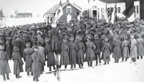 К февралю-марту 1918 года количество дезертиров в России дошло до 3 миллионов человек. Очередной вспышке дезертирства способствовали как стремление солдат успеть в свои деревни к разделу земли (который был легализован большевистским Декретом о земле от 27 октября 1917 года, но фактически начался несколькими месяцами ранее), так и развал снабжения армии. 2 декабря 1917 года, по сообщениям с Западного фронта, «длительное недоедание перешло в голод». На Северный фронт в декабре ежедневно прибывало по 31 вагону муки при норме в 92, а на Западный — даже по восьми при норме в 122. В декабре 1917 года начальник штаба пехотного корпуса Северного фронта полковник Беловский свидетельствовал, что «никакой армии нет; товарищи спят, едят, играют в карты, ничьих приказов и распоряжений не исполняют; средства связи брошены, телеграфные и телефонные линии свалились, и даже полки не соединены со штабом дивизии; орудия брошены на позициях, заплыли грязью, занесены снегом, тут же валяются снаряды со снятыми колпачками (перелиты в ложки, подстаканники и т. п.). Немцам все это отлично известно, так как они под видом покупок забираются в наш тыл верст на 35-40 от фронта»[52]