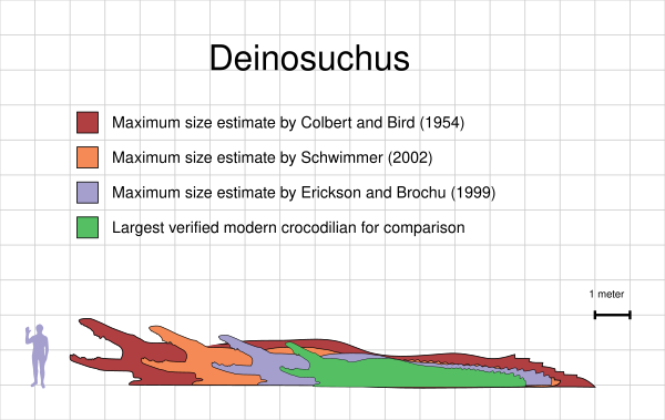 По данным исследования Швиммера, более поздняя разновидность дейнозуха (D. riograndensis) достигала значительно больших размеров и обитала в западной части континента. Это может говорить о том, что те или иные факторы заставили дейнозухов мигрировать и со временем увеличиться в размерах[13][11]. Поскольку известные остатки западных дейнозухов очень фрагментарны, достаточно трудно оценить их размеры. В 1954 году Эдвин Н. Кольбер и Роланд Т. Бёрд реконструировали нижнюю челюсть дейнозуха (образец AMNH 3073) длиной 1,8 м и рассчитали «на основе сравнительных измерений» с современным кубинским крокодилом, что общая длина тела гигантского крокодила (известного на тот момент как Phobosuchus riograndensis) могла достигать 15 м[4]. Однако, в настоящее время данная реконструкция черепа считается недостоверной[11]. Хорошо сохранившийся череп, обнаруженный в Техасе, показывает, что длина головы животного составляла 1,31 м, и исходя из этого Швиммер определил общую его длину в 9,8 м[11]. Значение в 8—10 м — ранее было предположено Грегори М. Эриксоном и Кристофером А. Брошу для того же образца в 1999 году[18][11]. Более крупный экземпляр дейнозуха (TMM 43632-1), длина черепа которого оценивается в 1,475 м, на основе пропорций современного миссисипского аллигатора был оценён Фарлоу и соавторами в 10,64 м[19]. Хотя крупнейшие остатки черепов дейнозухов слишком плохо сохранились, чтобы использовать эти методы оценки, масштабирование от позвонков предполагает, что некоторые из них достигали ещё более крупных размеров. Таким образом Швиммер определил длину AMNH 3073 и CM 963 (голотипа «Deinosuchus hatcheri») в не менее чем 12 м, а возможный вес — до 8,5 т или более. Длина их черепов скорее всего превышала 1,5 м[11]. Причём, известны и более крупные позвонки дейнозухов, размеры которых не уточняются[11]. Предполагается, что крупнейшие представители D. riograndensis, не сохранившиеся в палеонтологической летописи, могли быть ещё больше в линейных размерах. Это весьма вероятно, учитывая очень маленькую выборку окаменелостей западного дейнозуха[13][11]. Также существуют отметины от зубов дейнозуха на панцире морской черепахи, в 4—5 раз превышающие аналогичные отметины от зубов 4-метрового нильского крокодила, которые могут свидетельствовать об огромном размере оставившего их животного (хотя, поскольку находка соответствует ареалу меньшего вида D. rugosus, это довольно таки спорно)[13].