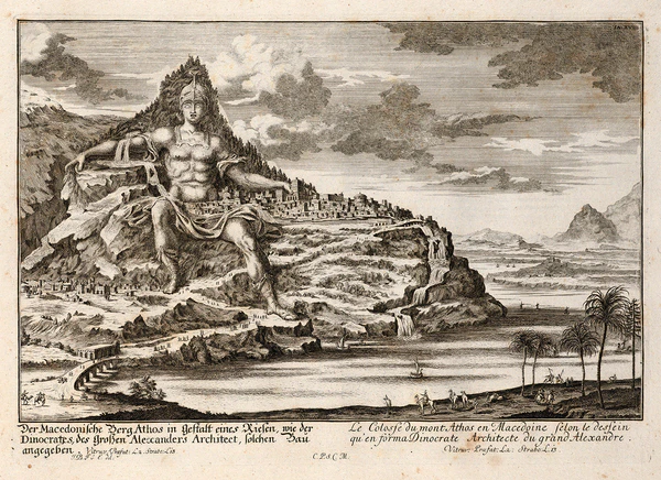 При первой аудиенции Дейнократ, согласно тексту Витрувия, предложил Александру сделать из горы Афон «изваяние в виде мужа» (намекая на самого Александра), «в левой руке которого изобразить укреплённый город, а в правой — чашу, вбирающую воду всех находящихся на горе потоков, чтобы из неё она вытекала в море». Предложение Дейнократа понравилось Александру, однако от его реализации он отказался, сказав, что достойнее для великого правителя сделать себе памятник иным образом: построить город на более подходящем месте, но оставил архитектора при дворе. Эта легенда переосмысливалась архитекторами и скульпторами в эпоху итальянского Возрождения и барокко. Согласно воспоминаниям Асканио Кондиви, ученика великого Микеланджело Буонарроти, однажды, осматривая горный пик в Карраре, Микеланджело сказал: хорошо бы сделать из цельной горы огромную статую[5]. Возможно, что этот рассказ вдохновил архитектора и рисовальщика австрийского барокко Фишера фон Эрлаха Старшего на создание композиции «Памятник Александру Великому».