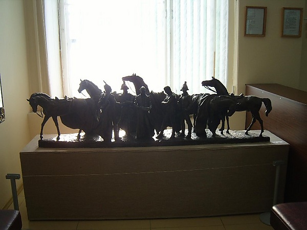 Композиция состоит из 10 фигур. На переднем плане расположены 5 мужских фигур. В центре находится фигура с листком. С левой и правой сторон изображены по 2 фигуры в военной форме первой четверти XIX века. На заднем плане размещены 5 верховых лошадей. Четыре головы лошадей приподняты влево, одна — вправо. Одна из лошадей склоняет голову к земле, а левое копыто одной из них приподнято.