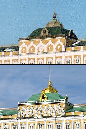 - Демонтаж советской символики. Например, на здании Большого Кремлёвского дворца герб и надпись СССР были заменены на пять двуглавых орлов.