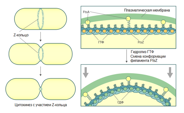 Белок FtsZ — прокариотический гомолог тубулина с похожей третичной структурой[1]. Это позволяет предполагать, что ассоциация FtsZ в Z-кольцо может напоминать сборку микротрубочек эукариот. FtsZ, как и тубулин, обладает ГТФазной активностью, гидролиз ГТФ обеспечивает полимеризацию FtsZ с образованием линейных протофиламентов. Z-кольцо — динамичная структура: молекулы FtsZ в составе кольца постоянно заменяются молекулами из цитоплазматического пула[12][13].