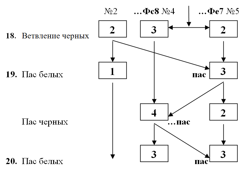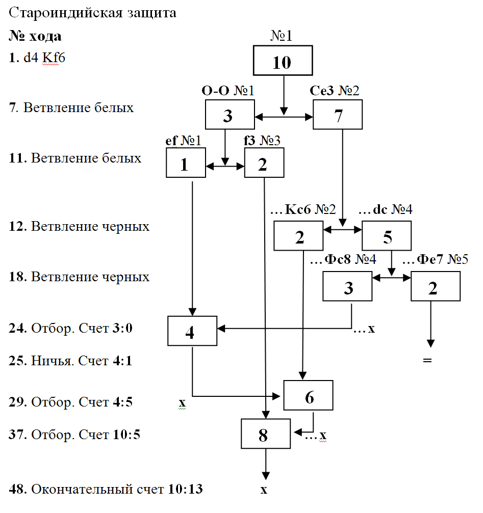 На Схеме № 4 показано увеличение числа ветвей (после 7 хода — две ветви, после 11 хода — три ветви, после 12 хода — четыре ветви, после 18 хода — пять ветвей). Затем в результате отборов и ничьей (соответственно на 24, 25, 29 и 37 ходе) число ветвей постепенно уменьшается. После 37 хода до конца игры остаётся только одна ветвь с рейтингом 8.