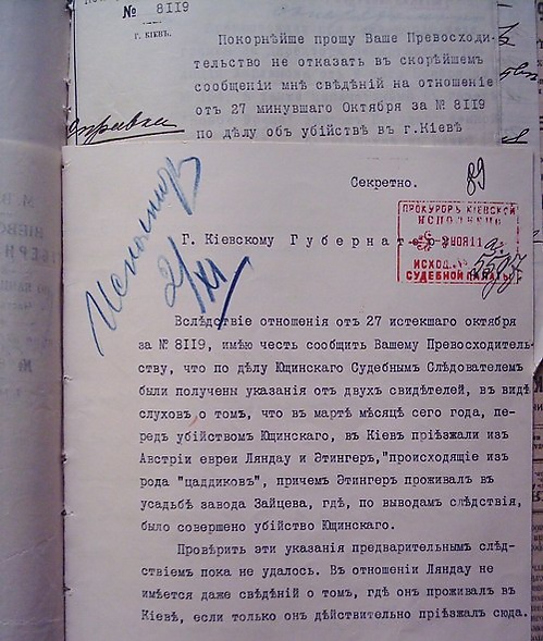 На следующий день, 18 апреля, фракция правых в Думе постановила сделать соответствующий запрос министрам юстиции и внутренних дел. Министерство юстиции отреагировало немедленно: в тот же день министр Щегловитов обратился к министру внутренних дел и председателю Совета Министров Петру Столыпину с просьбой обратить на дело Ющинского особое внимание и составил телеграмму в Киев, возложив наблюдение за делом на прокурора Киевской судебной палаты[комм 2] Георгия Чаплинского. Это было началом официальной политизации дела Ющинского. Георгий Чаплинский — поляк, перешедший в православие, всячески демонстрировал свою близость к крайне правым, по отзывам сотрудника, «в своих беседах поражал своим крайним юдофобством и той ненавистью, с какой он говорил об евреях»[51]. По свидетельству Василия Фененко, Чаплинский открыто высказывал свою симпатию еврейским погромам[52].