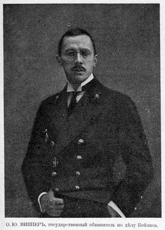 Некоторые члены Киевской судебной палаты считали, что дело должно быть прекращено за отсутствием улик[143]. Председатель Киевского окружного суда Николай Грабор отказался вести дело[144]. Он был заменён специально переведённым из Умани Фёдором Болдыревым, которому Щегловитов пообещал место председателя окружной судебной палаты[145]. Среди сотрудников киевской прокуратуры не нашлось желающих выступать в суде в роли государственного обвинителя, поэтому Щегловитов был вынужден отправить в Киев товарища прокурора Петербургской судебной палаты Оскара Виппера[146]. Изначально Чаплинским на эту роль планировался товарищ прокурора Карбовский, которого для этого специально 10 ноября 1911 года перевели из Винницы в Киев и который создавал лжесвидетельства для обвинения Бейлиса в ритуальном убийстве[147].