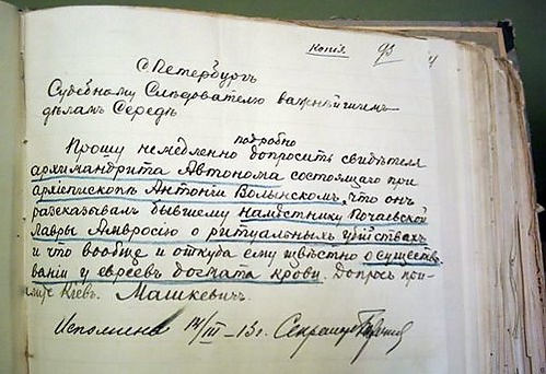 Известно ли им (министрам), что в России существует преступная секта иудеев, употребляющая для некоторых обрядов своих христианскую кровь, членами каковой секты замучен в марте 1911 года в городе Киеве мальчик Ющинский? Если известно, то какие меры принимаются для полного прекращения существования этой секты и деятельности её сочленов, а также для обнаружения тех из них, кои участвовали в истязании и убийстве малолетнего Ющинского?