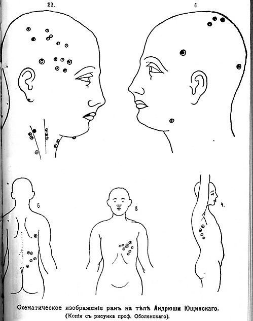 Характер орудия и множественность поранений, частью поверхностных, в виде уколов, служат указанием на то, что одной из целей нанесения их было стремление причинить Ющинскому возможно сильные мучения. В теле его осталось не более трети всего количества крови; на белье и одежде имеется ничтожная часть её, а остальная кровь вытекла, главным образом, через мозговую вену, артерию у левого виска и вены на шее. Ближайшей причиной смерти Ющинского послужило острое малокровие от полученных повреждений, с присоединением явлений асфиксии<удушения>[68]. Эти выводы, лёгшие в основу обвинения Бейлиса, были после публикации обвинительного акта единодушно опротестованы российскими и европейскими специалистами, которые указывали, что они противоречат приведённому самими экспертами фактическому материалу: согласно этому материалу, мальчик сначала лишился сознания от удара в голову, затем был придушен, и уже после этого — посмертно или в момент агонии — ему было нанесено большинство ранений. Они в основном носят поверхностный характер и никак не могут свидетельствовать о намерении выточить кровь[69].