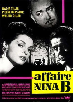 Оригинальный текст (англ.)[показатьскрыть]Clearly Siodmak had not abandoned his exploration of postwar German society, and he felt that L' Affaire Nina B., based on actual events, presented him with a perfect opportunity. The plot was based on periodic reports in the press regarding influential citizens of West Germany who found their reputations sharply compromised by documents in the possession of East Germans which revealed war crimes in the their pasts. Not all of the revelations were genuine, and many were made in the self-interest of the accusers, who had taken advantage of access to old police records to blackmail Nazi fugitives, especially those who had assumed certain levels of power in major industries.— Robert Siodmak: A Biography, with Critical Analyses, 1998 год[2]