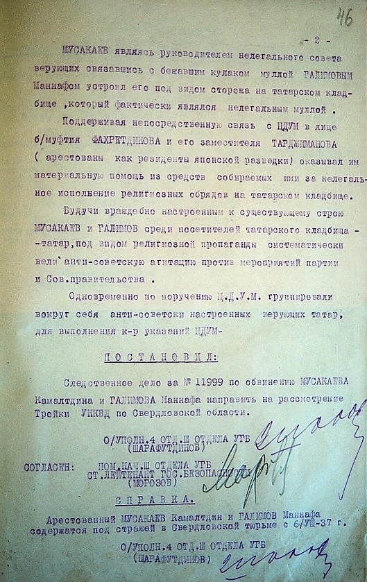Сторож Маннаф взял к себе муазина Байдагулова, который жил под маской «сторожа» же на СУГРЭСе. Байдагулов нигде не работает, а живёт на «подачках», как «священный» человек. Таким образом, остатки мулл и муазинов татарское кладбище превратили в центр своей контрреволюционной деятельности. Они имеют тесную связь с Центральным Духовным Управлением — муфтием, получают от него указания. Вместе с так называемым «Я муфтий города» Камалетдином Мусакаевым и Мухаметзяновым среди населения собирают деньги. Для покрытия своего подлинного лица, для живой связи с религиозными элементами пользуются 8-9 летней девочкой.