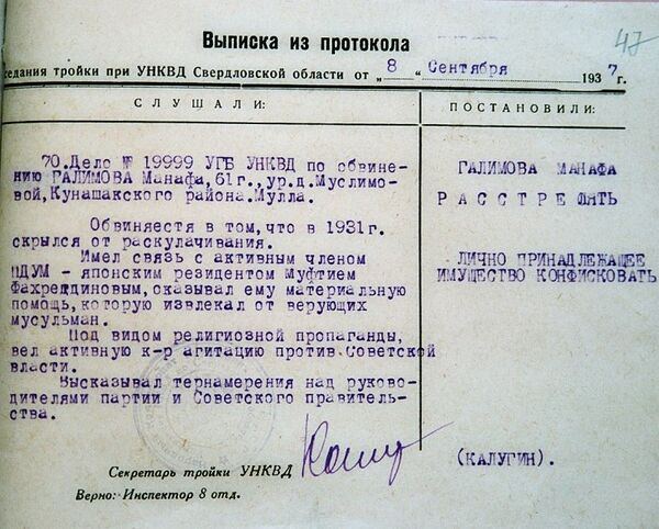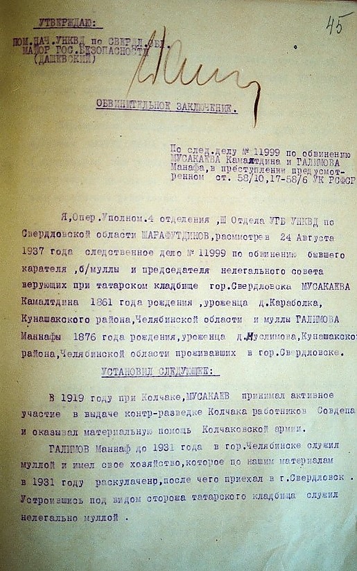 В итоге было возбуждено дело № 11999 в отношении Галимова и Мусакаева (оба были арестованы с 6 июля 1937 года). Мусакаева обвиняли в том, что он поддерживал колчаковские власти и в 1919 году выдал им двух агентов, которые были расстреляны[48].