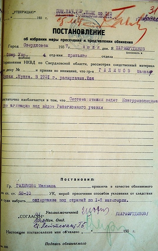 5 лет тому назад в Свердловск приехал мулла дер. Муслимова Куншаковского р-на Челябинской области Галимов Маннаф. Он устраивается «сторожем» на татарском кладбище. Под маской «сторожа» он ведёт своё тёмное дело. Он устраивает панихиды, читает коран и т. д. Наряду с этим этот бандит, под предлогом устройства «гаид» группирует вокруг себя все остатки контрреволюционных элементов из татар, готовит себе «кадры».