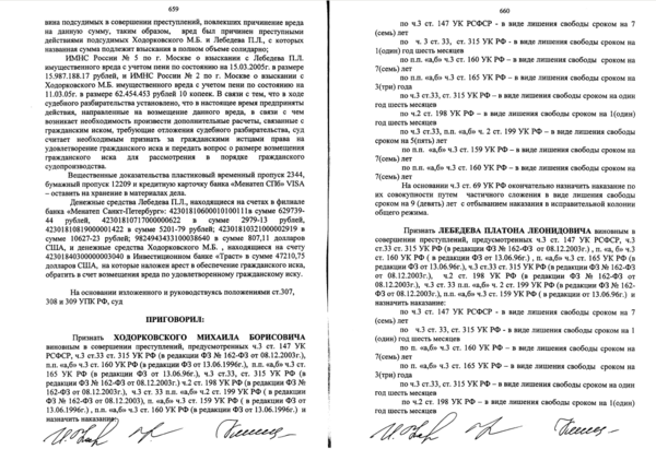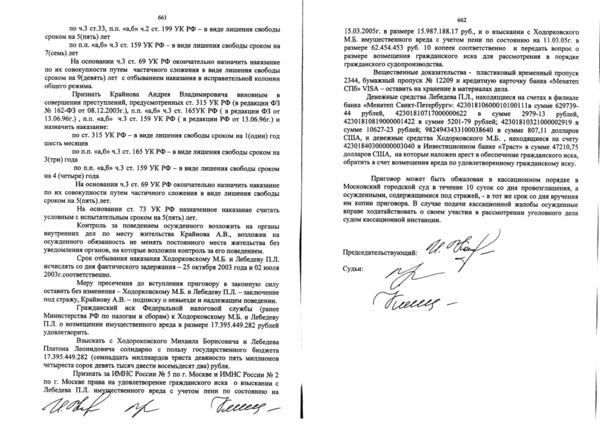 - Решение Мещанского районного суда Москвы от 31 мая 2005 года о назначении Ходорковскому и Лебедеву наказания в виде девяти лет лишения свободы[6].