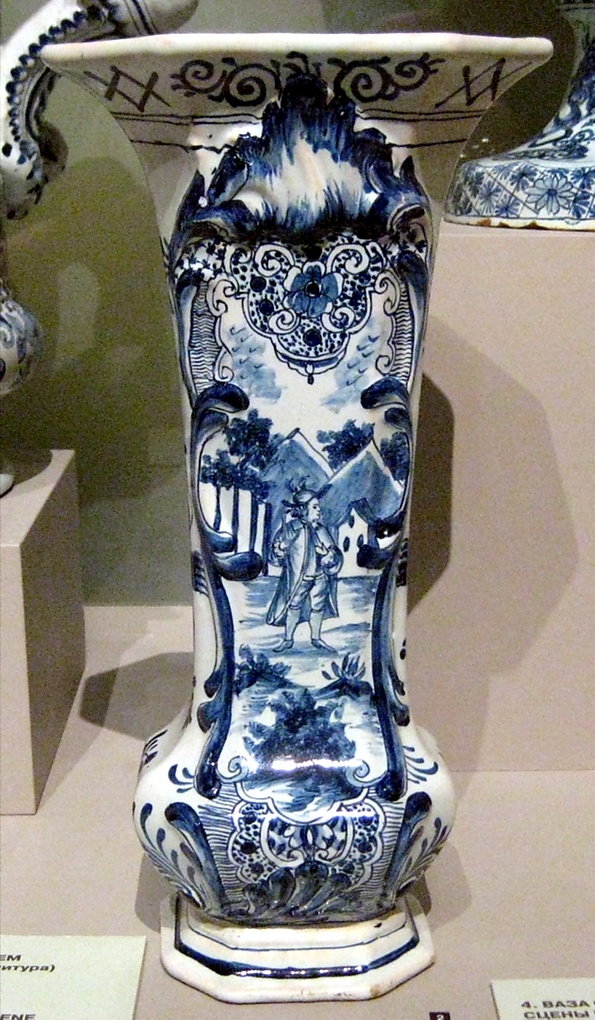 «Живописцы Делфта старательно изображали китайцев и китаянок под зонтиками на фоне мало понятной им архитектуры, дополняя композицию росписи европейским барочным орнаментом, элементами голландского сельского пейзажа, цветами и птицами. Такая причудливая смесь получила название голландско-китайского стиля»[6]. Изготавливали вазы, подсвечники, разнообразную посуду, облицовочные плитки. Постепенно появлялись оригинальные формы ваз с ребристой поверхностью, прямоугольных фляг, ваз для тюльпанов с множеством венчиков или сделанных в виде китайских пагод[9].