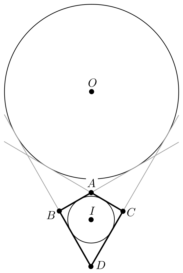 - Если дельтоид выпуклый, то можно построить окружность, касающуюся продолжений всех четырёх сторон (см. рисунок).
