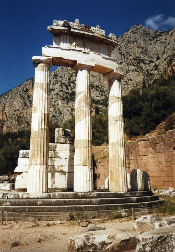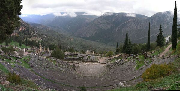В древности Дельфы являлись общегреческим религиозным центром, в котором, несмотря на политеистический характер верований, доминировал культ бога Аполлона[32]. Город считался духовным ядром эллинского мира благодаря расположению здесь одного из самых влиятельных оракулов античности — Дельфийского оракула[33].