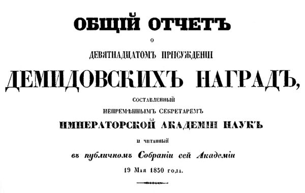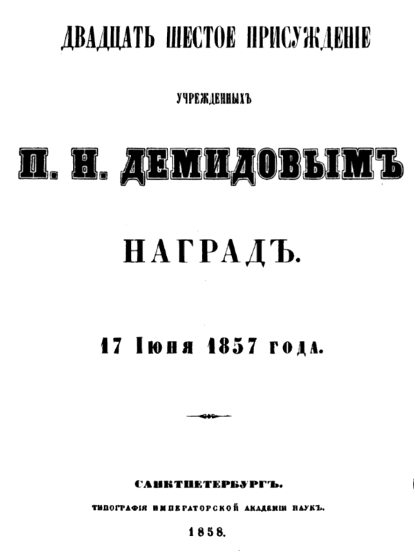 - Общий обзор Демидовских наград за все время их существования с 1831 по 1864 год // Тридцать четвертое, и последнее, присуждение учреждённых П. Н. Демидовым наград. — Санкт-Петербург, 1866. — С. 21—56.