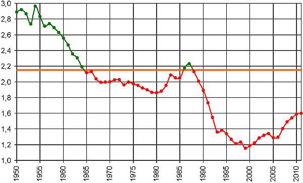 Рождаемость в СССР, в частности среди Европейских народов и республик, сначала упала ещё в 1967 ниже уровня воспроизводства населения (2,1 рождения на одну женщину).