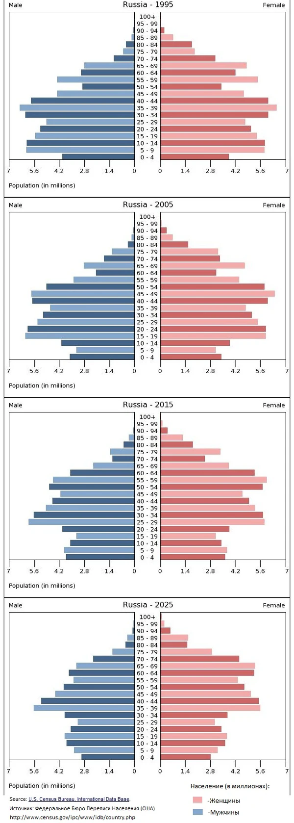 К 2025 году по некоторым прогнозам в России будет дефицит трудовых ресурсов[133]. Трудоспособное население России к 2020 году сократится на 7—8 млн, к 2050 году — более чем на 26 млн[134]. К 2030 году трудоспособное население в России по оценкам сократится на 12 %[135]. Юрий Крупнов пишет о сокращении трудоспособного населения на 10 млн к 2025 году вследствие демографического кризиса[136].