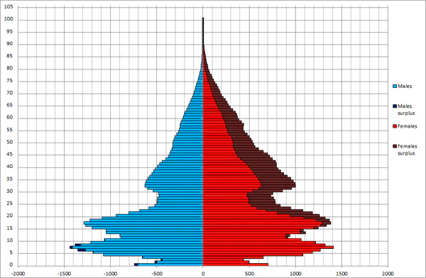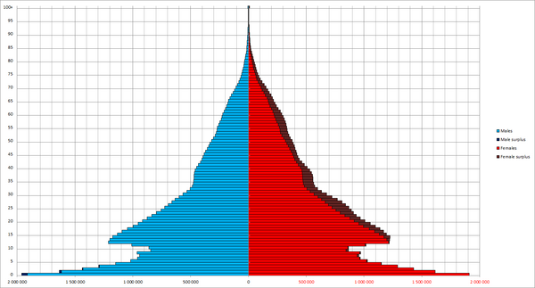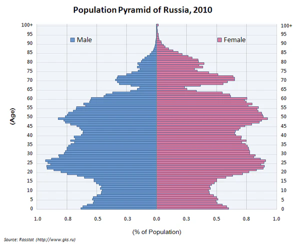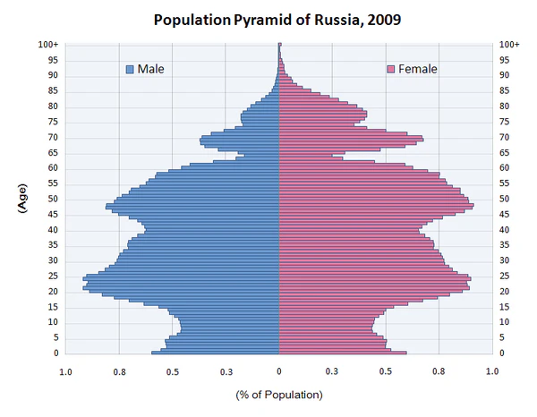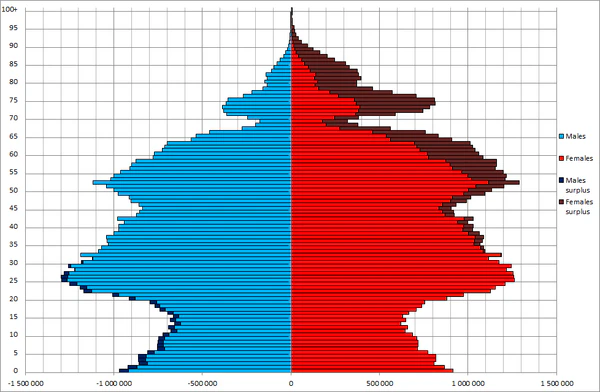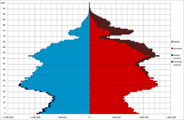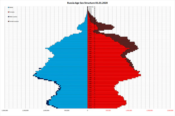 Россия конца XIX века представляла собой страну с молодым населением: число детей существенно превышало численность лиц пожилого возраста. До 1938 года население СССР оставалось «демографически молодым», однако позже, начиная с 1959 года, началось его демографическое старение: доля лиц молодого возраста стала сокращаться, а лиц пожилого возраста — увеличиваться, что стало результатом снижения рождаемости[149]. В 1990 году Россия занимала 25-е место в списке стран с высокими показателями старения населения. По состоянию на 2020 год доля людей в возрасте 65 лет и старше в населении России составляет 15,5 %. По этому показателю Россия занимание 44 место в мире и идёт сразу после Белоруссии[150]. По оценкам Росстата на начало 2018 года, на 1000 женщин старше трудоспособного возраста в России приходилось 423 мужчины старше трудоспособного возраста. Из-за того, что пенсионный возраст мужчин в России на 5 лет выше, чем у женщин, а смертность мужчин заметно выше, в пожилом населении преобладают женщины — доля мужчин среди населения старше трудоспособного возраста составляет на начало 2018 года — 29,7 %[151]. В России доля людей в возрасте 65 лет и старше в населении страны, лишь на 7,8 % меньше чем в Италии (23,3 %) второй по старости нации в мире и лишь на 12,9 % меньше чем в Японии (28,4 %) самой престарелой нации в мире[150]. Это может быть связанной с тем что Италия как страна Юга Европы экономически не так привлекательная для потенциальных иммигрантов как соседние более богатые страны Европы, также Италия страдает от перманентного экономического застоя. Япония находится почти три десятилетия в экономическом застое и постоянной дефляции, не маловажным фактором приведшем экономику Японии к данной ситуации, является демография. Уменьшение населения вызванное демографическим кризисом и старением Японии. Японская нация является самой престарелой и одной из самых быстро стареющих в мире. Причиной может быть относительно непродолжительный по времени послевоенный беби-бум в Японии и строгая иммиграционная политика.