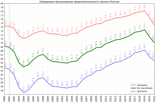 К концу 1990-х годов темпы естественной убыли населения превысили 900 тыс.[35] По данным переписи населения 2002 года, численность населения России с 1989 по 2002 год сократилась на 1,8 млн (~на 1,3 %)[37]. Особенно велика была смертность среди российских мужчин, средняя продолжительность жизни которых равнялась 61,4 года[38]. Средняя продолжительность жизни женщин за тот же период составила 73,9 года[38].