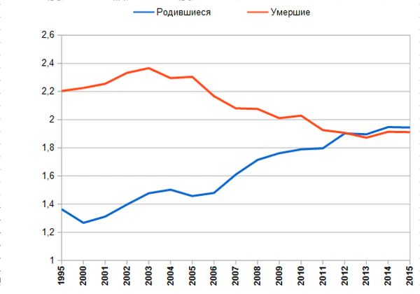 В 2015 году в России родилось 1,944 млн детей, в 2016-м — 1,893 млн, в 2017 году — 1,690 млн[51]. Согласно данным Росстата, в 2017 году возникла естественная убыль населения: родилось 1 689 884 человек, умерло 1 824 340 человек, естественная убыль населения составила 134 456 человек. В 2020 году родилось 1 436 541 человек, умерло 2 138 586 человек, естественная убыль населения составила 702 072 человек. В первом полугодии 2022 года появилось на свет 635 200 детей, что на 42 900 или на 6,3 % меньше, чем в аналогичном периоде 2021 года[52].