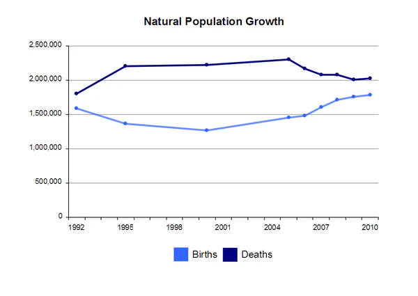 Резкое падение коэффициента рождаемости (до 1,157) произошло после экономического кризиса 1998 года[9]. В остальном, аналогичные демографические тенденции обычны для индустриальных и постиндустриальных обществ, как в развитых, так и в развивающихся странах, где уже завершился демографический переход[10].