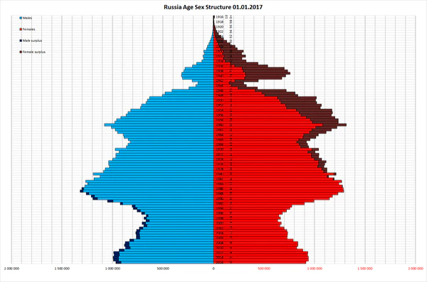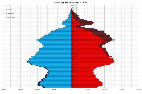 За первое полугодие 2015 года в России родилось 926,8 тыс., а умерло 988,1 тыс. В июне 2015 года впервые с начала года был естественный прирост в 4,5 тыс.[48] В январе—июне 2015 года естественная убыль удвоилась, а миграционный прирост сократился по сравнению с тем же периодом 2014 года[49]. По состоянию на 2015 год число подростков сократилось за последние 15 лет на 40 %[50]. На 2021 год в России насчитывалось чуть более 7,5 млн женщин в возрасте от 20 до 29 лет (около 5,1 % населения России). С 2010 года количество женщин в данном возрастном диапазоне сократилось на 37,5 %.[22]
