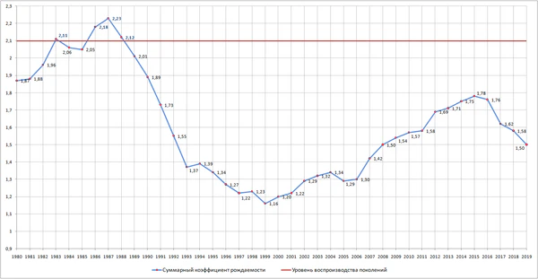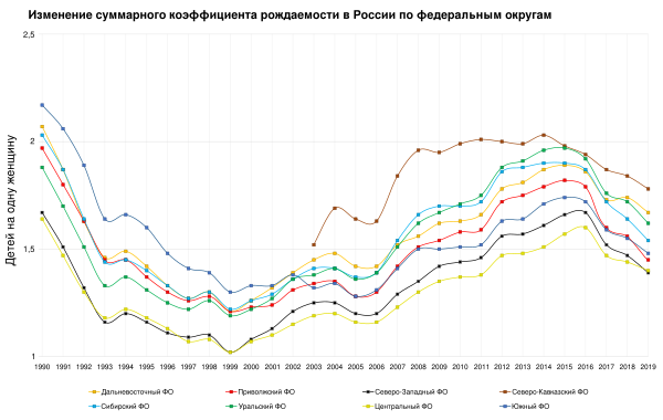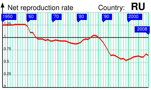 С 1925 по 2000 год суммарный коэффициент рождаемости в России снизился с 6,80 до 1,21 ребёнка на одну женщину, из них 71 % общего снижения приходятся на 1925—1955 годы[20]. Несмотря на этот спад и потери в результате войны, население РСФСР за 1925—1955 годы выросло на 25 млн. Резкий спад коэффициента рождаемости произошёл в начале 1990-х[21]; в это же время смертность в России стала устойчиво превышать рождаемость. На 2021 год в России насчитывалось чуть более 7,5 млн женщин в возрасте от 20 до 29 лет (около 5,1 % населения России). С 2010 года количество женщин в данном возрастном диапазоне сократилось на 37,5 %[22]. С 1990 по 2019 годы суммарный коэффициент рождаемости (СКР) в России снизился с 1,892 до 1,504 рождений на женщину, а мировой СКР за указанный период времени снизился с 3,249 до 2,403 рождений на женщину[23][24][25].