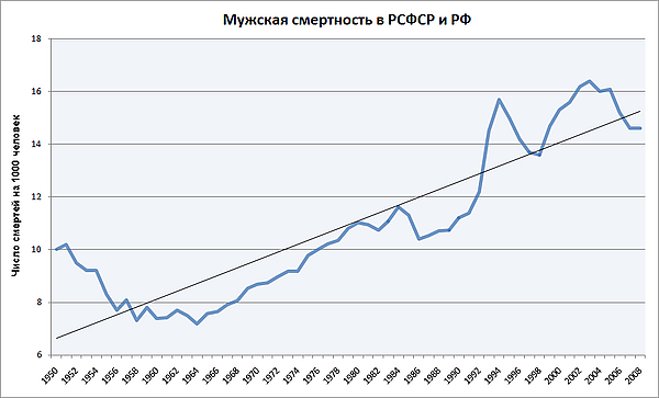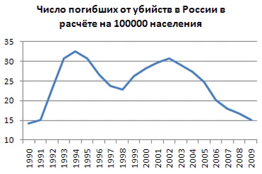 В 1990-х годах смертность в 1,5 раза превышала рождаемость[35]. Ежегодная смертность трудоспособного населения возросла почти с 49 до 58 человек на тысячу в 1992 г. по сравнению с 1990 г., а к 1994 г. достигла 84 человек в год на тысячу населения. Средняя продолжительность жизни мужчин в России в «лихие девяностые» снизилась почти на 6 лет. При резком росте смертности общая численность населения России показала абсолютную убыль, что было беспрецедентной ситуацией в мирное время, отмечает профессор Университета Джавахарлала Неру Утса Патнаик[36].