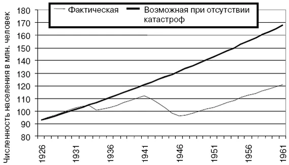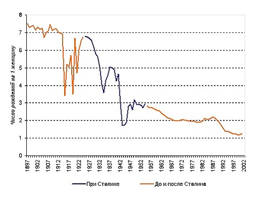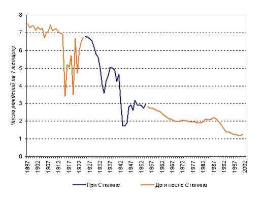 В 1930-х годах начался резкий спад рождаемости[20], при этом смертность оставалась на высоком уровне[27]. По мнению А. Г. Вишневского, демографические потери только в период 1926—1940 годов составили 9 млн (включая 7 млн избыточных смертей)[17]. Впрочем, среди некоторых историков распространено мнение, что при сохранении высокой рождаемости и недостаточно быстрой индустриализации, в силу мальтузианских процессов, число умерших от голода или других лишений могло бы быть существенно выше. Поскольку переход к урбанизированному индустриальному обществу с умеренной рождаемостью в России (и союзных республиках) начался гораздо позже стран Запада, а протекал крайне быстро, он неизбежно стоил населению больших жертв. С подробным описанием неомальтузианских взглядов на историю России можно ознакомиться в работах профессора Сергея Нефёдова. В то же время, как отмечает историк В. В. Кондрашин в своей книге, посвящённой голоду 1932—1933 годов[28]: