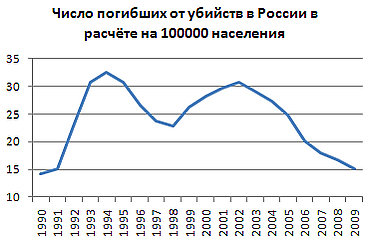 По оценкам экспертов, ежегодная смертность от болезней, связанных с курением, всё ещё составляет до 400 тысяч человек в год[113]. - Уровень насилия в обществе. В 2006 году некоторые демографы заявляли, что чрезвычайно высокий уровень насилия (включая бытовое насилие) представляет собой одну из основных угроз для развития человеческого потенциала в России[114]. С 2002 года в России наблюдается устойчивое снижение количества убийств и самоубийств[105]. По словам бывшего советника главы Конституционного суда РФ, генерал-майора милиции в отставке Владимира Овчинского, статистика по убийствам в России занижена в три раза[115]. К 2009 году число самоубийств снизилось до 37,6 тыс. (самый низкий показатель в новейшей истории России), а число убийств — до 21,4 тыс. (самый низкий показатель после 1990 года)[105].