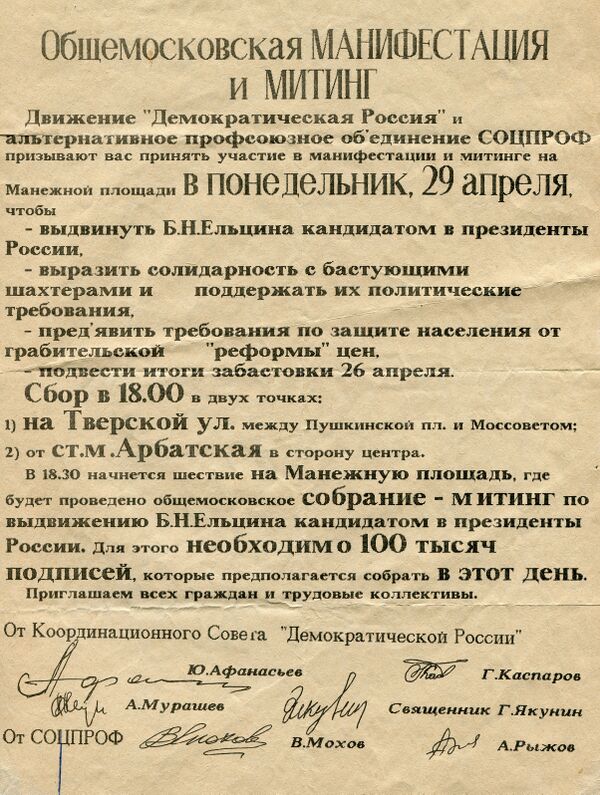 В феврале-марте 1991 Движение собирало множество сторонников на митингах и демонстрациях в Москве и Ленинграде, требуя отставки Президента СССР Горбачева и роспуска КПСС. В марте 1991 года Движение выступило «против» по предложенному Горбачёвым референдуму о сохранении СССР и за введения поста всенародно избираемого президента России. Движение вывело сотни тысяч людей на улицы Москвы, протестую против ввода войск в столицу 28 марта 1991 года, и добилось провала этого «предварительного ГКЧП».