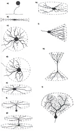 Одна из принятых, но и самых тяжёлых, в нейробиологии классификаций нейронов (основана Кахалем) основывается на их дендритной структуре и плотности. Однако, с другой стороны, есть нейроны, которые не имеют дендритов («адендритные нейроны»), а только разветвлённые аксоны (напр., нейроны дорсального корешкового ганглия и симпатического ганглия); есть нейроны со слишком сложными дендритами. К нейронным типам с наиболее характерными дендритными формами относятся[1]: