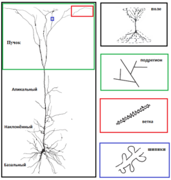 В связи с большим количеством типов нейронов и дендритов целесообразно рассмотреть морфологию дендритов на примере одного конкретного нейрона — пирамидальной клетки. Пирамидальные нейроны находятся во многих регионах мозга млекопитающих: гиппокамп, миндалина, неокортекс. Эти нейроны наиболее обильно представлены в коре головного мозга, составляя более чем 70—80 % всех нейронов изокортекса млекопитающих. Наиболее популярными, и поэтому лучше исследованными, являются пирамидальные нейроны 5 слоя коры: они получают очень мощный поток информации, которая прошла через различные предыдущие слои коры, и имеют сложную структуру на поверхности мягкой мозговой оболочки («апикальный пучок»), которая получает входные импульсы из иерархически обособленных структур; далее эти нейроны посылают информацию другим корковым и подкорковым структурам. Хотя, подобно другим нейронам, пирамидальные клетки имеют апикальные и базальные дендритные пучки, им также присущи дополнительные отростки вдоль апикальной дендритной оси — это т. н. «наклонённый дендрит» (oblique dendrite), который раз или дважды ветвится от основания. Особенностью дендритов пирамидальных нейронов является также то, что они могут отправлять ретроградные сигнальные молекулы (напр., эндоканабиноиды), которые проходят в обратном направлении через химический синапс к аксону пресинаптического нейрона[6].