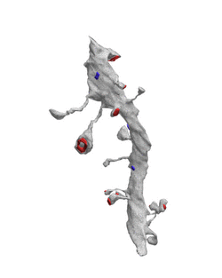 - e — разветвлённые шипики, каждая ветвь которых имеет свой собственный пресинаптический объект (типично для CA1- и CA3-пирамидальных нейронов, гранулярных клеток зубчатой извилины и клеток Пуркинье мозжечка)