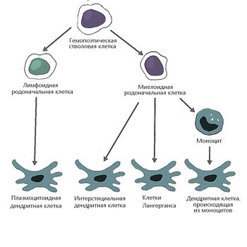Большинство дендритных клеток принадлежат к миелоидному ряду. Считается, что in vivo дендритные клетки могут образовываться как из гранулоцитарно-моноцитарных предшественников, так и из моноцитов. В культуре миелоидные дендритные клетки можно получить и из клеток костного мозга в присутствии GM-CSF и других цитокинов, а также из моноцитов в присутствии GM-CSF и IL-4. Дендритные клетки лимфоидного ряда дифференцируются из общего лимфоидного предшественника, а также предшественников T- и B-клеток, в частности, тимоцитов на самой ранней стадии их развития в тимусе (DN1-клеток). Предшественников лимфоидных и миелоидных дендритных клеток объединяет экспрессия цитокинового рецептора FLT3, что отличает их от предшественников других иммунных клеток. Таким образом, дендритные клетки могут образовываться из 6—7 клеточных источников[8].