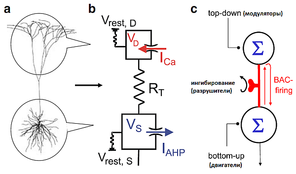 В отличие от обычной нейронной сети, уникальное строение пирамидального нейрона коры 5 слоя позволяет его индивидуальным единицам обрабатывать два потока информации отдельно и затем объединить их, используя только внутренние свойства клетки, таким образом уменьшая нагрузку на сложность сети нейронов. Поэтому, как следствие особой формы и направленности пирамидальных нейронов 5 слоя коры, в сочетании с уникальной организацией коры, механизм «BAC firing» идеально подходит для ассоциирования в пределах нескольких миллисекунд корковых путей прямой (feed-forward) и обратной (feedback) связи в пределах одного нейрона, то есть сочетание восходящей («bottom-up») сенсорной информации с нисходящими («top-down») ассоциативными сигналами[85].