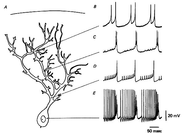 В клетках Пуркинье генерация дендритных спайков более проста: поскольку в их дендритах нет Na+ каналов, дендритные потенциалы действия обусловлены Ca2+ каналами, что согласуется с большей шириной (spike width) этих спайков.