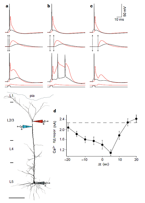 Итак, после сочетания bAP и подпорогового ВПСП, конечная форма нейронного импульса будет состоять из 1) первого аксонного потенциала и 2) второго и третьего ПД, связанных с дендритными спайками. Такой сложный механизм и характеризует «BAC firing», необходимость временной синхронности которого соответствует такой же временной точности STDP-пластичности на отдалённых синапсах.