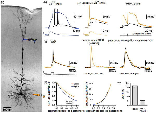 И хотя в большинстве нейронов обратное распространение потенциала действия значительно ослабевает по мере удаления от сомы, недавние исследования базальных дендритов пирамидальных нейронов 5 слоя продемонстрировали, что высокочастотные пачки (bursts) потенциалов действия могут распространяться в отдаленные базальные дендриты, вызывая регенеративную активацию потенциалзависимых Ca2+ каналов, что ведет к генерации дендритных Ca2+ спайков[72].
