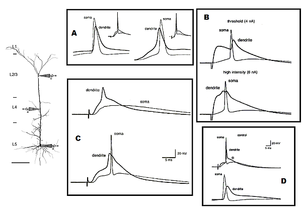 Одним из самых уникальных примеров влияния дендритных Ca2+ спайков на распространение синаптического потенциала и активного влияния на сому являются пирамидальные нейроны 5 слоя коры. Вследствие относительно большой длины апикального дендрита много синапсов находятся настолько далеко от сомы, что при отсутствии какого-либо компенсирующего механизма, они не окажут никакого влияния на соматический потенциал.[25]. Впрочем, не только значительное пассивное затухание, но даже активные (Iр и K+ каналов А-типа) токи способны в этих нейронах привести к существенному ослаблению входного синаптического сигнала[26][27].