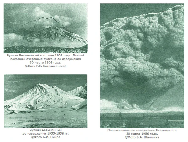30 марта 1956 года на Камчатке произошло извержение вулкана Безымянный. Высота пепловой колонны превысила 40 км. Пепел замутнил атмосферу вокруг всего земного шара[3]. Взрыв полностью уничтожил вершинную часть постройки вулкана и частично разрушил восточную. Образовался кратер диаметром 1,5 километра, высота вулкана уменьшилась на 250 метров[4].