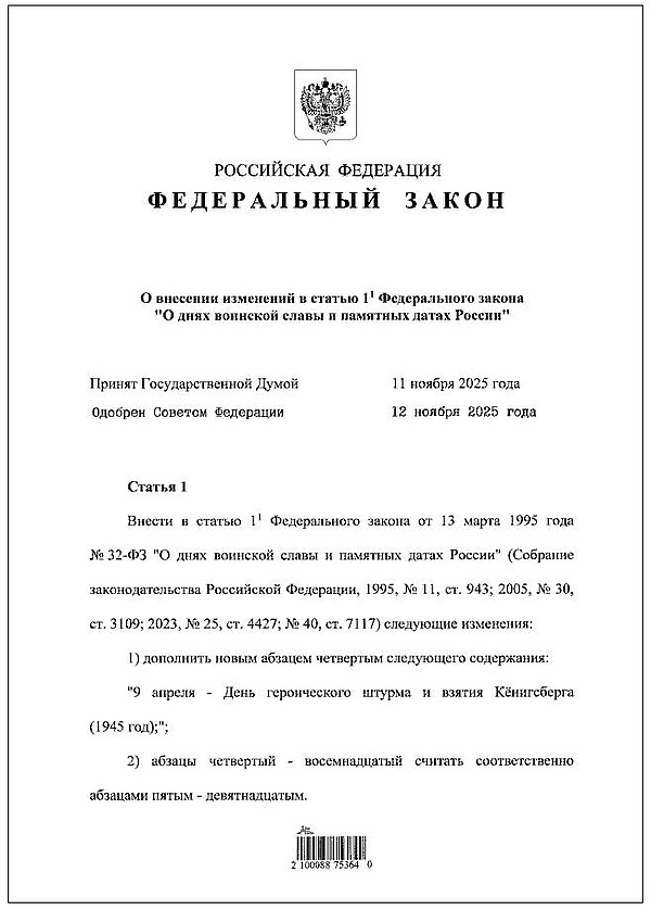 Официальный статус памятной даты России был закреплен Федеральным законом № 421-ФЗ от 17 ноября 2025 года, который внес изменения в закон «О днях воинской славы и памятных датах России». Документ был принят Государственной думой 11 ноября и одобрен Советом Федерации 12 ноября 2025 года[1].