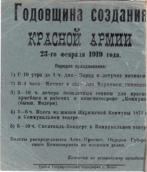 10 января 1919 года председатель Высшей военной инспекции РККА Николай Подвойский отправляет во ВЦИК предложение отпраздновать годовщину РККА 28 января: