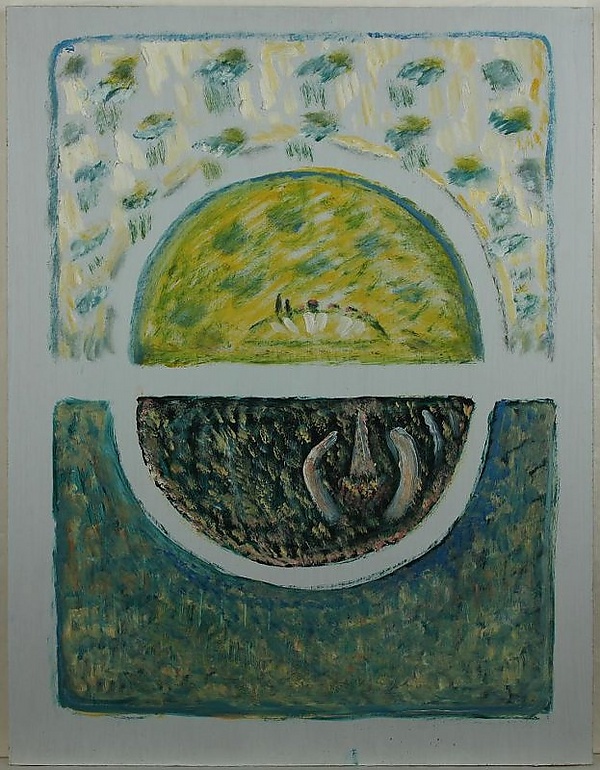 Композиция работы построена на чётком делении пространства на две части: верхнюю, выполненную в светлых тонах, и нижнюю, выдержанную в тёмной цветовой гамме. В центре изображена сферическая форма, разделённая по горизонтали и оконтуренная белой полосой. В верхней части композиции располагается светлый прямоугольник и жёлтая верхняя полусфера; на её фоне условно обозначены бугорок земли, домики и ели. Нижняя часть картины содержит прямоугольник сложного голубого цвета с изображением чёрной нижней полусферы, включающей светло-жёлтые элементы. На этом фоне справа схематично представлена Эйфелева башня и две дугообразные полосы.